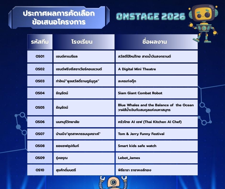 - ทีมชนะเลิศ จะได้รับรองสิทธิ์ตัวแทนประเทศไทยไปแข่งขัน RoboCupJunior OnStage 2026 ณ ประเทศเกาหลีใต้